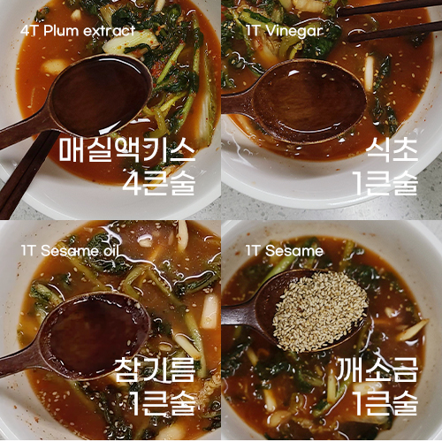 그릇을 준비해 김치를 조금 꺼내고 김치국물 4 국자를 떠서 넣어줍니다. 물 100ml, 매실진액 4큰술, 식초 1큰술, 참기름 1큰술, 깨소금 1큰술을 넣어 섞어줍니다. 김치가 많이 익었다면 식초를 넣지 않아도 되고 취향에 따라 단맛과 신맛을 가감해 주시면 됩니다.