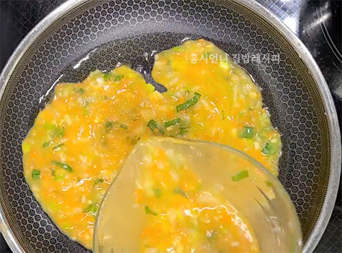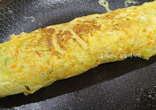 중불로 달궈진 프라이팬에 식용유를 두르고 달걀물 2/3 정도를 부어줍니다. 중간중간 부풀어 오르는 곳은 뒤집개로 구멍을 내서 평평하게 해주고 말기 편하도록 끝부분이 들러붙지 않게 뒤집개로 계속 떼어내주세요.