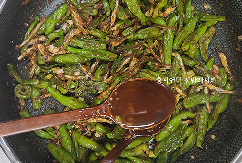꽈리고추가 연해진 것이 확인되면 멸치를 넣고 섞어주다가 만들어둔 양념장을 부어 볶아줍니다. 이렇게 1-2분 정도 볶아 꽈리고추의 숨의 거의 죽어 연해질 때까지 볶아줍니다. 이때부터 더 연하게 하느냐 식감 있게 하느냐는 취향껏 해주시면 됩니다.