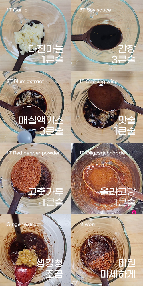그릇에 다진 마늘 1큰술, 간장 3큰술, 매실진액 3큰술, 맛술 1큰술, 고춧가루 1큰술, 올리고당 1큰술, 생강청 조금을 넣고 잘 섞어줍니다. 감칠맛을 더 원하시면 미원을 살짝 넣어주세요.