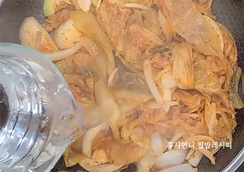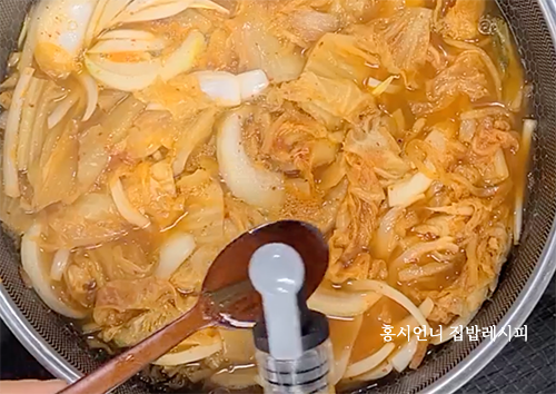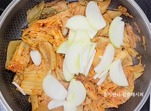 묵은지 김치 1쪽을 먹기 좋게 썰어준 뒤에 냄비에 넣어줍니다. 이대로 불에 올려 볶아주다가 양파 1개를 얇게 썰어서 양파가 투명해질 때까지 볶아줍니다.