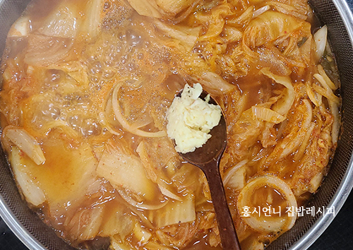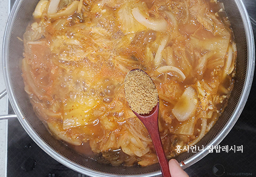 양파가 투명해지면 물 1.2L를 붓고 뚜껑을 닫아준 뒤에 다시 끓어오르면 매실진액 2큰술, 국간장 1큰술, 다진마늘 1큰술, 다시다 1작은술을 넣고 섞어줍니다. 묵은지의 신맛이 강하면 매실진액을 더 넣어줍니다.