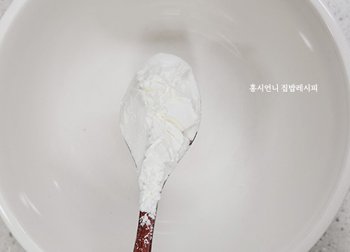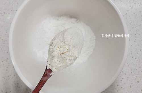 그릇에 전분가루 3큰술, 부침가루 1큰술, 물 100ml를 넣고 잘 섞어줍니다. 전분가루는 감자 전분가루를 사용했는데 다른 전분가루를 사용하셔도 무방합니다.