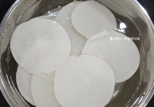 무는 깨끗하게 씻은 뒤에 3mm 정도의 두께로 썰어줍니다. 냄비에 굵은소금 1큰술을 넣고 끓인 뒤에 썰은 무를 넣고 1분 정도 데쳐줍니다. 너무 오래 데치면 아삭함이 사라지니 너무 오래 데치지 않고 시간 되면 체에 밭쳐 물기를 빼주세요.