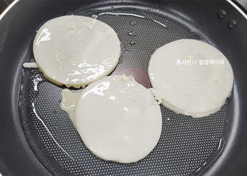 달궈진 팬에 식용유를 둘러준 뒤에 반죽을 묻힌 무를 올려줍니다. 전분가루가 들어가서 서로 들러붙을 수 있으니 조금 떼어서 놓아주시고 앞뒤 노릇하게 익으면 그릇에 놓을 때도 서로 떨어뜨려 놓아주세요.