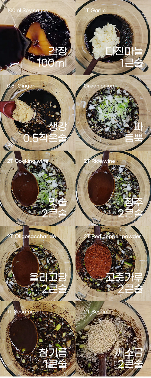그릇에 간장 100ml, 고추청 50ml, 다진마늘 1큰술, 생강 0.5작은술, 잘게 썰은 파 듬뿍, 맛술 2큰술, 청주 2큰술, 올리고당 2큰술, 고춧가루 2큰술, 참기름 1큰술, 깨소금 2큰술을 넣고 섞어줍니다. 고추청이 없다면 생략해도 무방하고 단맛을 더하려면 올리고당, 매운맛을 더하려면 고춧가루를 추가해 주세요.