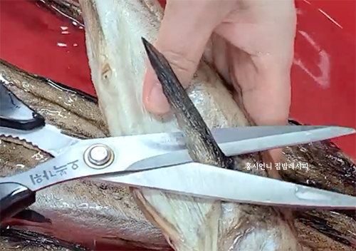 잘 말려진 통북어는 단단하기 때문에 그냥 손질하면 다칠 수 있어요~ 물에 4시간 정도 담가두었다가 말랑말랑해지면 지느러미를 잘라주고 머리를 잘라줍니다. 머리는 따로 냉동보관해 두면 국물요리할 때 유용해요~