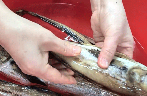 통북어는 뼈가 그대로 있기에 뼈를 제거하고 잔가시들도 제거해줍니다. 비린내가 날 수 있기에 내장과 검은 비늘 등을 깨끗하게 제거해 준 뒤에 팬에 넣을 수 있는 크기로 썰어줍니다. 팬의 크기가 크다면 통으로 사용하셔도 됩니다.