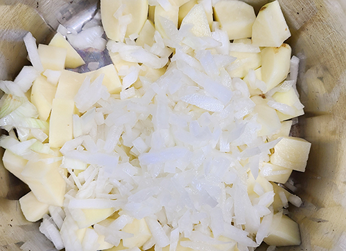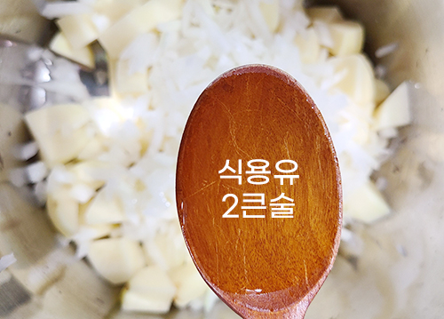 양파 1/2개도 감자와 마찬가지로 깍둑썰기 해도 되는데 양파의 식감에 거부감이 있다면 양파를 잘게 썰면 식감에 부담을 주지 않으면서도 단맛과 풍미를 향상해 줄 수 있습니다.