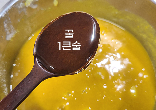 약불로 줄이고 꿀 1큰술을 넣고 눌러 붙지 않게 계속 저어주며 3분 더 끓여 줍니다. 카레가 짜게 나온 편이라 꿀을 넣으면 짠맛을 조금 중화시켜 주는 역할을 해줍니다.