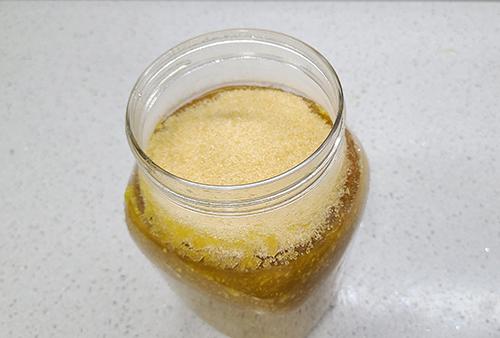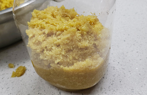 이제 적당한 통에 간 생강을 넣어주고 여기에 설탕 1kg을 부어줍니다. 생강과 설탕의 양은 1:1로 하면 되기에 꼭 레시피와 똑같이 할 필요는 없습니다. 집에 준비된 양에 따라서 다르게 넣어주면 됩니다. 이렇게 두면 몇 분만 지나도 바로 설탕이 녹아들어 가는 것이 보이는데요, 냉장고에 넣고 한 달 정도 보통은 한달 안에 소비를 하면 좋다고 합니다.