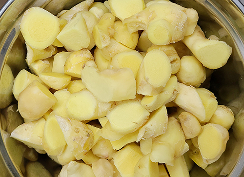 싱싱한 생강을 1kg 구매해서 물에 살짝 담궈둔 뒤에 바로 껍질을 제거해 줍니다. 생강의 모양이 일정하지 않아서 껍질을 까지 어려운 편인데 넓은 면은 칼날로 긁어내듯이 껍질을 벗겨주고 좁은 부분은 칼날을 넣어 세심하게 긁어주어도 되고 조각을 내어 편하게 벗겨내도 됩니다. 이제 생강을 믹서기에 넣고 갈아주면 되는데 너무 크면 제대로 갈려지지 않으니 조각조각내어 조금씩 갈아줍니다.
